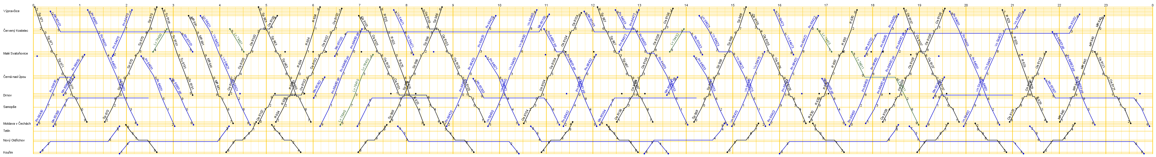 Běžný provoz ČSD na jednokolejné trati s možností dvoukolejných úseků trati v období III./IV. epochy. Nákladní doprava s vozy volného oběhu.