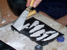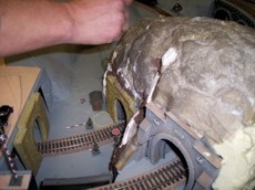 A o hodinu později začala modelářská dílna. Zdejší prezentace byla zaměřená na výhody materiálů nabízené firmou NOCH, takže nějaké sádry a podobné materiály se zde neprezentovaly. Hmota označená Special Hydrocal jako sádra vypadá, ale na rozdíl od ní je minimálně 5x lehčí a obsahuje látku, kterou získává větší pružnost a nepraská. Namíchá se z ní řídká kaše, která se nalije do forem . Do hodiny hmota vytvrdne a dá se z forem vyndat. Hotové odlitky skal jsme se pak učili barvit a patinovat. Seznámili jsme se se zajímavými vychytávkami, jak při patinování postupovat. Lepení odlitků na podklad se doporučuje obyčejnou disperzí a nebo další hmotou od firmy NOCH , kterou je „Fels-Spachtel“ (dělá se ve dvou barevných odstínech: žula a pískovec). Prášek z pytlíku se opět velmi snadno rozmíchá a nanáší se špachtličkou na podklad. Hmota obsahuje plnidlo, které na povrchu vytvoří nepravidelné hrbolky. Hodí se do spár mezi dvěma odlitky skal, ale i na volné plochy, kde má být skalisko. Po vytvrdnutí se dá dále patinovat.