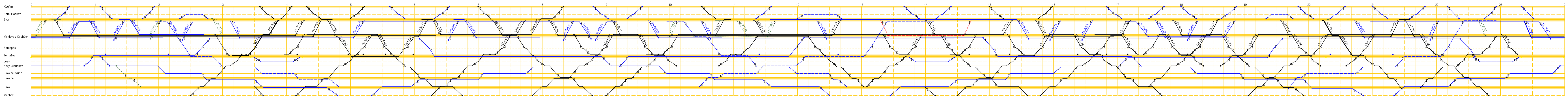 Layout letošního našeho jarního setkání vznikal na základě sítě, kterou layoutář konzultoval s tvůrcem GVD. Občas se lze setkat s plány layoutů, u nichž tento důležitý bod layoutář přeskočil nebo vynechal, a tvůrce GVD je pak postaven před nemožný úkol zkonstruovat jízdní řád na síti, na níž to nejde. Máme veliké štěstí na osvícené a zkušené konstruktéry GVD a layoutu, kteří se této chybě dlouhodobě a úspěšně vyhýbají.