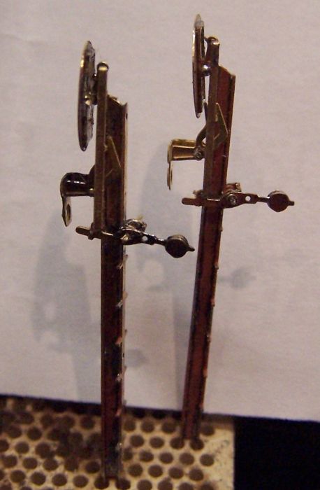 Po odskúšaní funkčnosti som návestidlo rozmontoval a namočil do vlažnej saponátovej vody aby som diely zbavil zbytkov chemikálií po pajkovaní. Po vyschnutí som diely opieskoval. Na obrázku je vidno rozdiel medzi stožiarmi po opieskovani jedného z nich. Potom som vsetky diely nastriekal základnou farbou a potom svetlo šedou Agamou.
