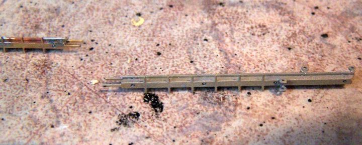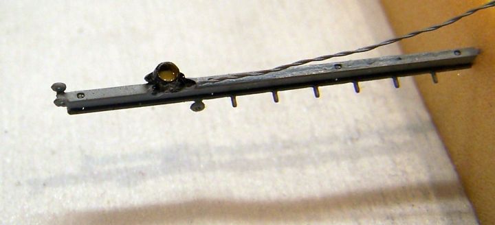 Diely som potom navliekol na vrták 0,5mm a prehrial plynovou pákovačkou. Na obrázku je vidno stopy po cíne aj z druhej strany držiaka ramena, ktoré vznilkli po predchádzajúcom opačnom namontovaní držiaka :-) Tým boli všetky diely nachystané a mohol som si odskúšať činnosť návestidla pred jeho povrchovou úpravou.