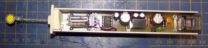 Ďalšia zmena bola ešte v použitom tiahle. Predtým som použil tiahlo z gitarovej struny "g" ale tá sa mi nakoniec zdala moc tuhá a bál som sa, že pri nastavovaní dĺžky tiahla sa môže poškodiť mechanika návestidla, objavil som drôt z materálu Neusilber NSR03. Tuhosť mi pripadá akurát medzi mäkkým mosadzným drôtom a tvrdým kaleným gitarovým. Do betónového podstavca som vyvŕtal diery pre stožiar, tiahlo a vodiče pre LED, ktoré som pripájkoval na kolíky pre LED. Pred stožiar príde ešte umiestniť symbol typu predzvesti.