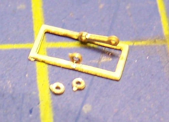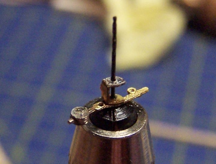Zostávajúce podložky som potom využil na osku okolo ktorej sa terčík otáča. Ako osku som použil mosadzný drôt 0,4mm presahujúci z každej strany držiak terčíka o 1mm. Na jeden koniec osky som podložku prispájkoval. Druhý koniec osky som nechal volný, ešte sa budu všetky časti povrchovo upravovať.