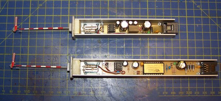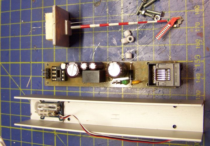 Osadenú DPS upevníme na pripravený U profil. Pod DPS dáme distančné podložky výšky 3mm, aby sa nám spoje odspodu DPS nedotýkali profilu. Ja som si ich vyrobil z lízatka, kde sa vhodná trubička po vylízaní lízatka nachádzala. Odstrihneme konektor zo serva a vodiče priletujeme ku kolíkom 1,2,3. Zapojíme ovládanie serva cez konektor RJ12. Pri správnom zapojení súčiastok sa servo po zapnutí napájania dva krát otestuje prejdením do polôh navestidla Stoj a Voľno a potom sa nastaví do zvoleného stavu. Prepínaním vstupov si odskúšame funkčnosť ovládania. Na obrázku sú všetky potrebné diely. Zoznam potrebných súčiastok, komponentov a orientačných cien TU