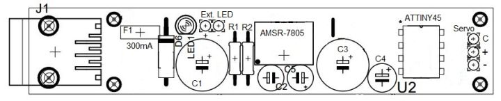 Konvertor chránia nízkoimpedančné kondenzátory 10uF, kapacita kondenzátora na výstupe má byť max. 1000uF, väčší sa tam aj tak asi nezmesti. Diódy na výstupe slúžia jednak na zníženie napájania serva na 4,5V - D4, niektoré serva to majú v katalógu a D5 slúži na oddelenie napájania ATTINY aby pri prepínaní stavov neprechádzala do resetu. Kód programu zostal pôvodný.