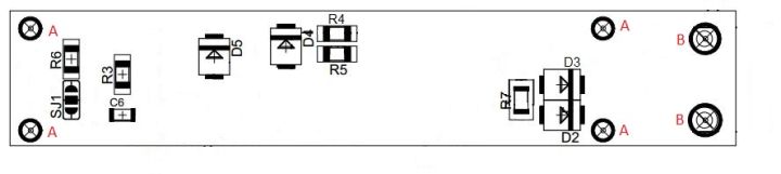 Osadenie súčiastok na DPS, pohľad zo spodnej časti, veľkosť otvorov je zväčša 0,8mm, drôtová prepojka 0,6mm, diery pre D6 a kolíkové lišty 1mm, diery "A" 2,1mm a diery "B" 3,2mm