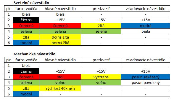 Samozrejme s rôznymi svetelnými návestidlami typu červená, modrá, biela a podobných kombinácií spoločných funkcií s mechanickými moc nenajdeme a ani to riešiť nebudeme a taktiež ich zapojenie zostáva na voľbe majiteľa dopravne, kde sa používajú. Taktiež pri návestidlách s napájaním 5V, ktoré poslednú dobu naberá na popularite z dôvodu využívania modelárskych serv na ovládanie výhybiek, ktoré sú taktiež na 5V sa odporúča použiť iný typ konektorov, aby nedošlo k ich zámene s 15V. Aj keď v tejto dobe sú už k dispozícií rôzne DC/DC konvertory, ktoré nám s malou stratou, rozmermi, cenou a veľkým výkonom prevedú už napätia rôznymi smermi. Takže použiť centrálne napájanie stanice 15V= a na jednotlivé obvody ovládania, ktoré vyžadujú 5V=, už nie je problém vyriešiť.