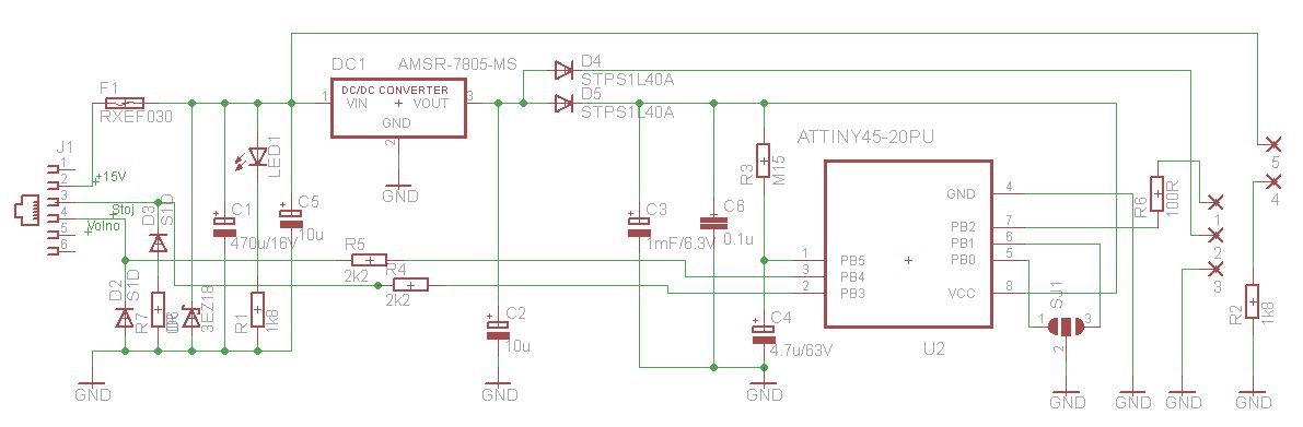 Schéma zapojenia sa okrem zmeny konektora, zapojenia pinov a DC1 veľmi nezmenila. Odpadlo aj zapojenie pinu pre podsvietenie návestidla. Odpor R7 slúži ako prepojka, a tá by sa dala zmenou polohy diód D2,D3 zrušiť. Nabudúce.