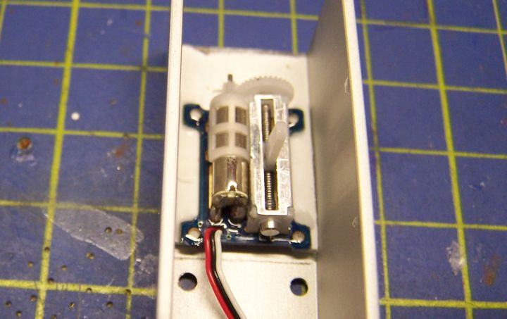Ako podložky pod servo som z bielej info tabuľky hrúbky 1,5mm odstrihol dva pásiky 20x3mm a prilepil päť minútovým epoxidom k profilu. Upevníme servo hustejším sekundovým lepidlom k podložkám.