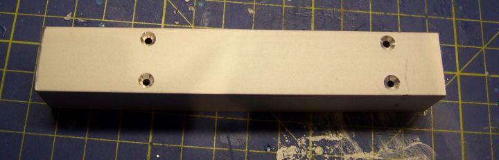 Odrežeme si hliníkový U profil 20x20mm v dĺžke 121mm. Vnútorná šírka profilu je 17mm pre umiestnenie DPS, serva a podstavca pre návestidlo. Na profil si navŕtame a zhĺbime otvory pre skrutky M2 podľa vyvŕtaných otvorov v DPS, ktorá je na spodnej časti zarovnaná s okrajom profilu.